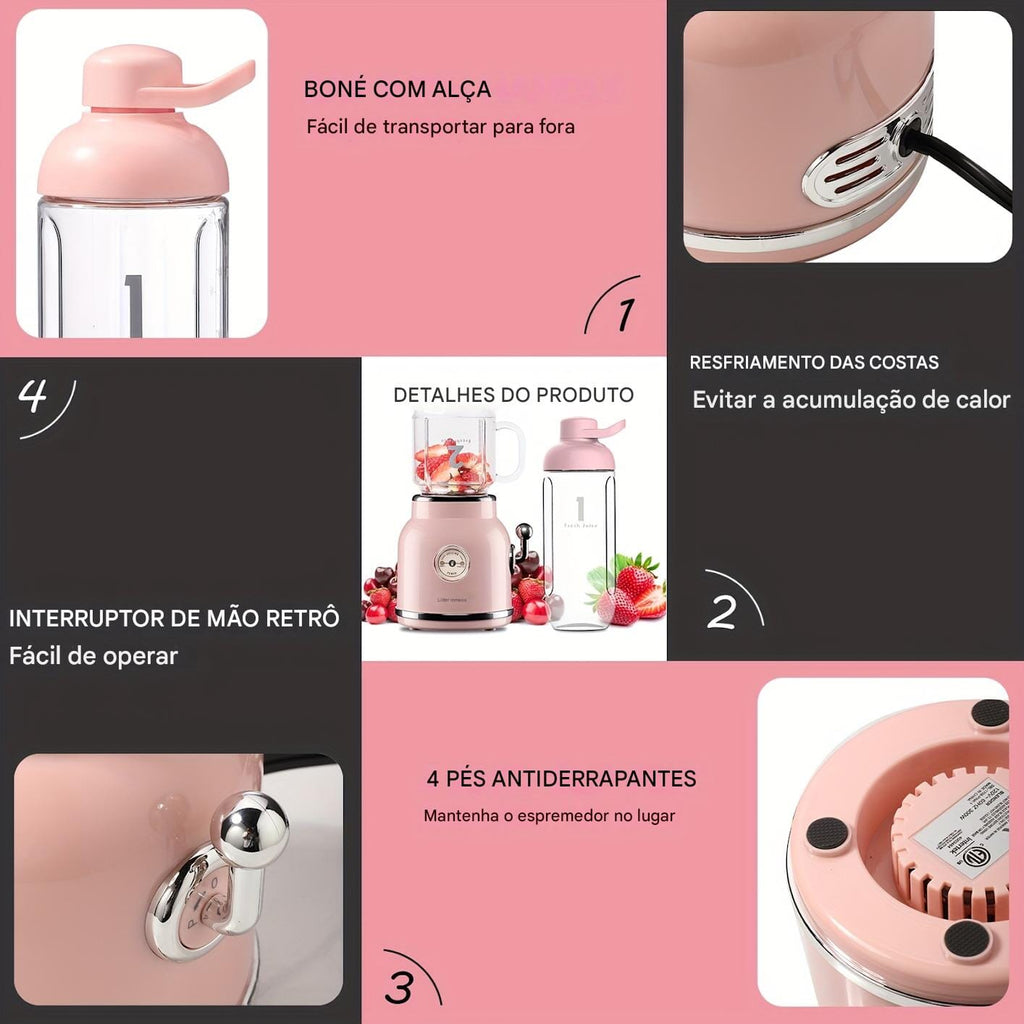 O Fresh Juice Retrô é projetado para ser seu companheiro de viagem ideal. Compacto e leve, ele cabe facilmente na sua bolsa, permitindo que prepare suas bebidas favoritas em qualquer lugar.